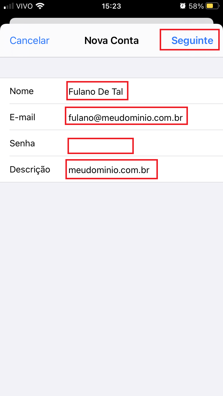 7. Preencha o seu Nome, o endereço de email que você quer configurar, a senha, e opcionalmente coloque uma descrição.