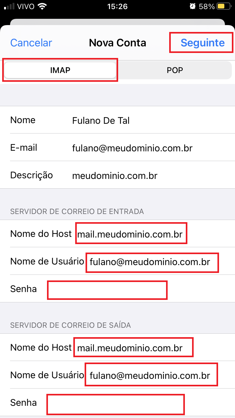 8. Na aba IMAP, em Servidor de Correio de Entrada, preencha o Nome do Host (formato: mail.meudominio.com.br), o Nome de Usuário (seu endereço de email) e a Senha.
